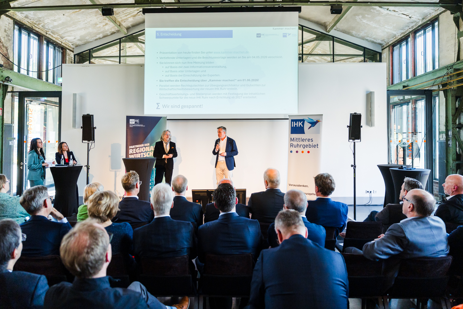 Bochum/Essen, 22. April 2026. Die Vorbereitungen für eine mögliche Vereinigung der IHK Mittleres Ruhrgebiet und der IHK zu Essen zur neuen IHK Ruhr erreichen die entscheidende Phase. Nach intensiven Prüfungen, zwei Informationsveranstaltungen sowie der Vorstellung zentraler Zwischenergebnisse liegt nun eine belastbare Entscheidungsgrundlage für die Mitglieder der Vollversammlungen vor. Am 1. Juni 2026 werden beide Gremien über eine mögliche Vereinigung abstimmen.